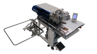 Macchina automatica per filetti, due aghi disinnestabili con distanza 10 mm, per profili tasche dritti e inclinati da 22cm. I coltelli hanno la possibilità di essere inclinati elettronicamente da pannello touch. Impilatore a barre automatico, terza mano per tenere fermo il materiale durante gli spostamenti del carro, aspirazione integrata. Crochet grandi con sensore controllo fine spolina, sensore per lettura pattina dx/sx e puntatori controllabili elettronicamente da pannello. Testa semi dry con motore incorporato. Tre modi di cucitura: singola, accoppiata, e a ciclo. Pannello touch screen da dove è possibile impostare le affrancature o l’infittimento a inizio e alla fine della cucitura.