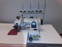 VEB 100-3 Macchina a punto invisibile, con il nuovo punzone molleggiato il quale garantisce punti senza arricciature e guida adatta alla cucitura di cinture. La cucitura può essere realizzata sopra o ai lati della cintura. Non sono necessary scambi di parti. Il trasporto inferior per la cinture garantisce il trasporto perfetto anche su materiali pesante.