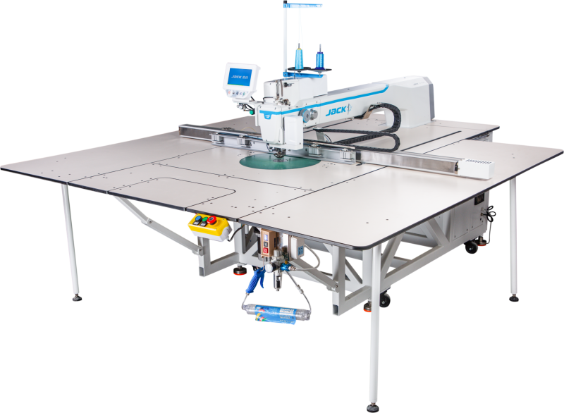 Jack MX100. Macchina a campo grande 140x95cm con barra d’ago rotante a 360 gradi per poter cucire sempre nello stesso verso e avere una cucitura sempre perfetta e precisa anche negli angoli e sulle curve. Adatta a materiali leggeri e pesant. Trasmissione a doppia vite per l'asse Y. WIFI integrato per industria 4.0, programmabile da PC in remoto via software oppure a bordo macchina. L'apertura e la chiusura del piano di lavoro permette una facile infilatura della macchina e un veloce cambio di spolina, inoltre i tavoli laterali si richiudono per facilitarne il trasporto e ottimizzare gli spazi. Piedino pressore regolabile per evitare salti del punto e rottura del filo anche sui materiali più difficili. Grazie al modulo RFID per la lettura a radiofrequenza della dima, il riconoscimento della lavorazione è precisa al 100% e più veloce.