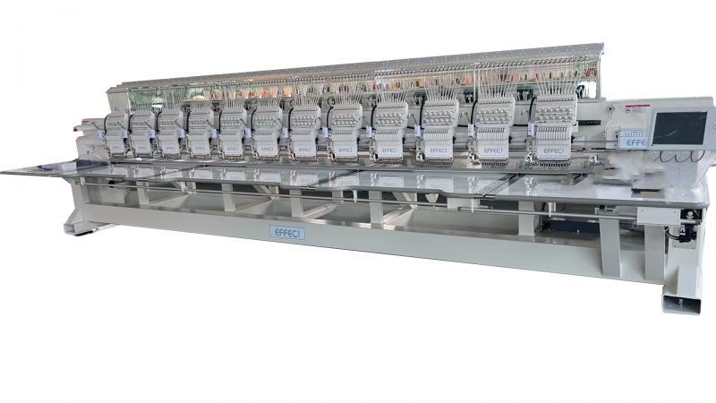 Macchina ricamatrice industriale a 12 teste e 12 Aghi a testa. Rasafilo e cambio barra d’ago automatico, dispositivo avvolgi filo incluso e valigetta attrezzi. Struttura robusta con sostegno incluso in grado di assorbire le vibrazioni anche ad alta velocità. Possibilità di caricamento o creazione di disegni tramite ampio display touch screen moderno in multilingua tra cui Italiano, tramite il quale è possibile selezionare diversi font e infittimenti.