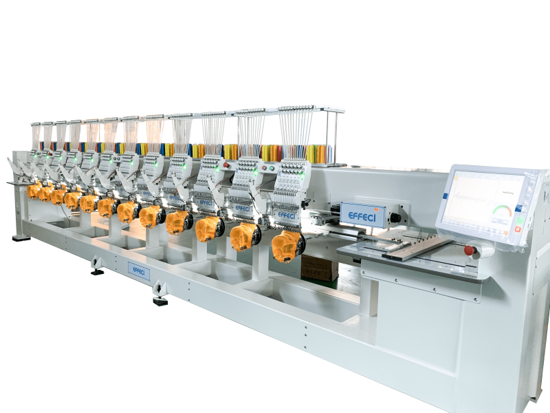 Macchina ricamatrice industriale a 12 teste e 12 Aghi a testa. Rasafilo e cambio barra d’ago automatico, dispositivo avvolgi filo incluso e valigetta attrezzi. Struttura robusta con sostegno incluso in grado di assorbire le vibrazioni anche ad alta velocità. Possibilità di caricamento o creazione di disegni tramite ampio display touch screen moderno in multilingua tra cui Italiano, tramite il quale è possibile selezionare diversi font e infittimenti.