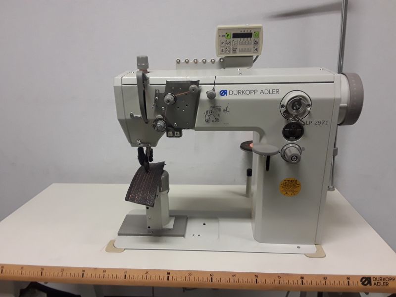 Macchina a Colonna nella versione a 1 ago (modello LP 2971 LH) o 2 aghi (modello LP 2974 LH) a punto annodato, piedino a rotella trainante, particolarmente adatta per cuciture su materiali per la produzione delle scarpe. Crochet maggiorato. La versione in -AUT è dotata di rasafilo, fermatura e alzapiedino.