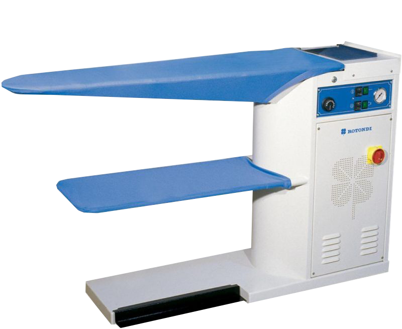 Tavoloda stiro con aspiranre o aspirante con soffiaggio (versioni A / S). Aspirazione con motore ad alta compressione a 0,37 KW - 0,5 HP. Riscaldato elettricamente. Moduli speciali su richiesta. Porta abiti. Imbottitura a 3 strati. Resto di ferro al silicio.