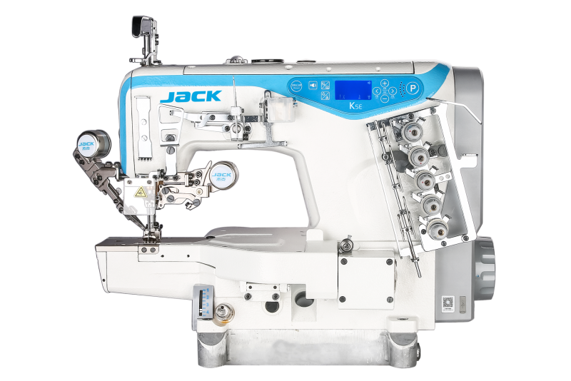 Jack K5E. Macchina a copertura a braccio avanzata con motorino passo passo per rasafilo e alzapiedino, risultano più silenzioni, precisi e veloci. Barra d’ago lubrificata. Macchina multifunzione: cambia semplicemente il kit per svolgere lavori diversi come orlatura o ribattitura.