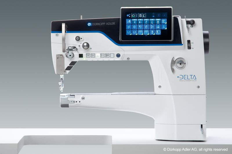Macchina a braccio cilindrico ad 1 ago triplice trasporto, motore integrato DAC flex control e Commander DELTA, regolazione allungapunto e corsa piedino regolabili con motorini passo-passo indipendenti, tensione elettronica.