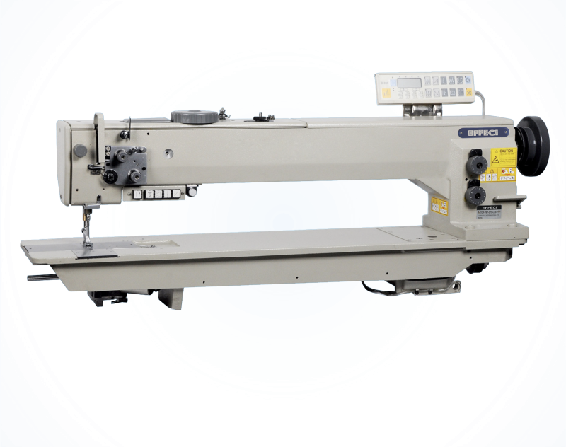 Macchina lineare triplice trasporto 1 o 2 aghi con braccio lungo (ampiezza sottobraccio 760x120mm), crochet grande, piedini alternati, lubrificazione completamente automatica. Alzapiedino pneumatico, affrancatura automatica, rasafilo automatico, seconda lunghezza punto programmabile (AUT). Adatta a pelle, divani, sedili per auto, bose, articoli sportivi.