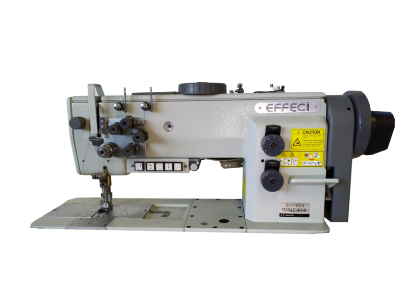 Macchina lineare triplice trasporto, 2 aghi, crochet maggiorato, rasafilo, travettatura automatica e alzapiedino. Dispositivo regolazione alternanza piedini e doppia lunghezza punto.