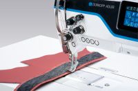 Macchina lineare triplice trasporto, crochet maggiorato, rasafilo, fermatura automatica e alzapiedino automatico. Dispositivo regolazione alternanza piedini.