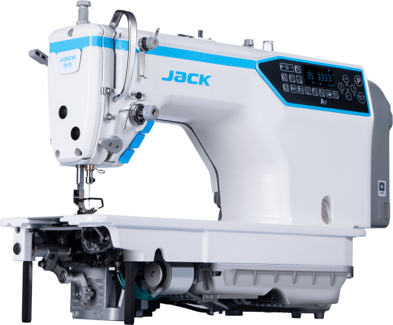 JACK A7. Lineare con movimento della griffa digitale, rilevamento spessore tessuto, regolazione digitale del punto, fermatura digitale silenziosa e motivi di cucitura. Apridischi tensione elettrici, bussola barra d'ago allungata. Rasafilo automatico, alzapiedino, fermatura digitale e taglio del filo corto 3,5mm. Bacinella olio sigillata e braccio da 260mm.