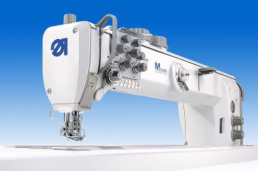 Macchine lineare a due aghi punto annodato, triplice trasporto, crochet extra grande ad asse verticale. Braccio lungo 1000mm.