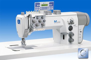 Macchine lineare a 2 aghi, punto annodato, triplice trasporto, crochet grande ad asse verticale. Dotata di rasafilo, fermatura ed alzapiedino
