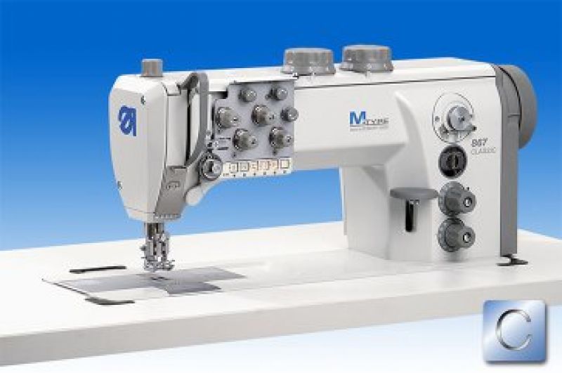 Macchine lineare a 2 aghi, punto annodato, triplice trasporto, crochet extra grande ad asse verticale. Dotata di rasafilo, fermatura ed alzapiedino