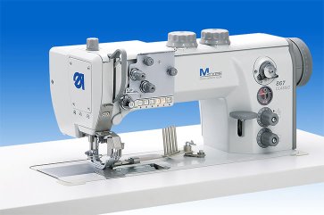 Macchine lineare punto annodato, triplice trasporto, crochet extra grande ad asse verticale con coltello rifilatore, dotata di rasafilo, fermatura ed alzapiedino. Per rifilare e bordare simultaneamente.