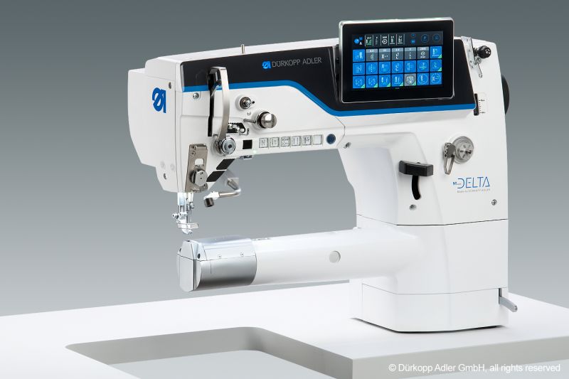 Macchina a braccio cilindrico ad 1 ago triplice trasporto, motore integrato DAC flex control e Commander DELTA, regolazione allungapunto e corsa piedino regolabili con motorini passo-passo indipendenti, tensione elettronica.