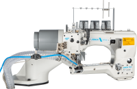 Macchina a braccio rovescio 4 aghi 6 fili con punto copertura. Motore integrato, rasafilo pneumatico e aspira ritagli adatta a intimo, costumi, tute da sub in neoprene, abbigliamento sportivo.