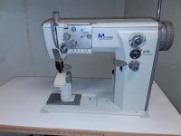 Macchine a colonna con trasporto a punta d’ago, rotella inferiore e piedino a rotella motorizzato, crochet grande ad asse verticale. Dotata di rasafilo, travettatura ed alzapiedino automatici