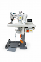 Macchina a braccio rovescio, 3 aghi, punto catenella con pannello touch screen. Utilizzata per ribattere e per cuciture a doppio incastro su jeans. Indicata per il cavallo del pantalone e la ribattitura del gambale. Dotata di puller a cinghia, per garantire il trasporto del materiale anche nei punti più difficili, alzapiedino, forbici elettriche e aspira catenella pneumatico.