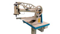 Macchina per la riparazione di scarpe con avanzamento a 360 °di cucitura. La macchina è dotata di un braccio cilindrico lungo con spazio di lavoro di 440 mm e crochet piccolo.