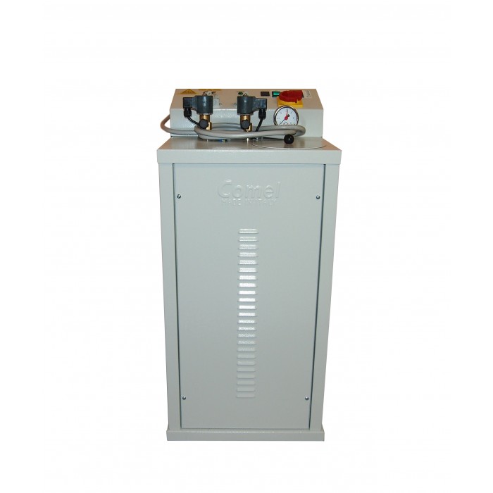 Generatore di vapore completamente automatico in grado di alimentare da 1 a 3 ferri a vapore. Il carico dell’acqua nella caldaia è effettuato tramite pompa o allacciamento diretto all’impianto idrico. In questo caso si richiede una pressione minima di 4 bar. Se provvisto di pompa come in questo caso, il generatore viene fornito anche di serbatoio per acqua incorporato.