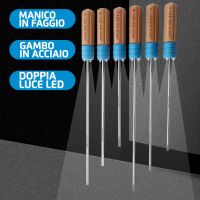 Cacciaviti con doppia luce led integrata con attivazione touch e ricarica con porta USB. Manico in faggio Europeo ergonomico con cappuccio in acciaio. Gambo in lega di acciaio con trattamento antiossidante e stelo smerigliato. Punte da 5” o 6” pollici e tre diverse misure disponibili.